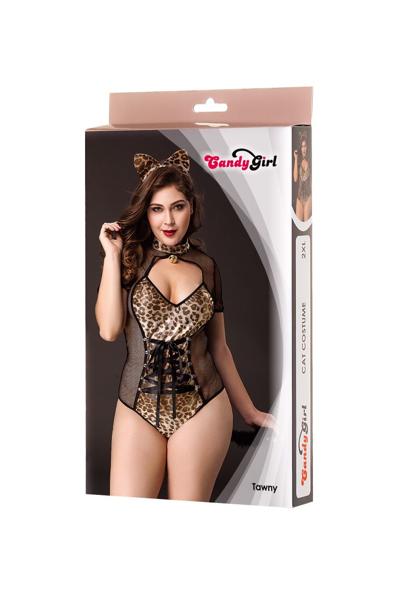 Ушки-ободок и боди хищной кошки с воротником-стойкой, золотистым бубенчиком, глубоким декольте, короткими рукавами и меховым хвостом. Вставки блестящего эластичного трикотажа визуально формируют приталенный силуэт. Талия декорирована темной шнуровкой. Вставки сетки по бокам зрительно обнажают фигуру.