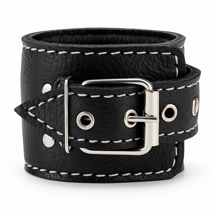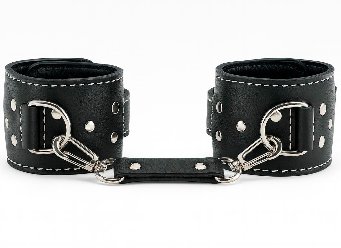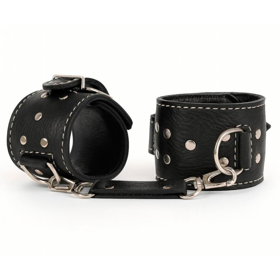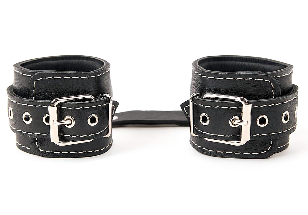 Оживить эротические игры Вам помогут наручники. Этот интимный аксессуар пользуется успехом у мужчин. Выполненные в черном цвете с белой отстрочкой и украшены прочными ремешками. Модный интимный аксессуар не сдавливает и не нарушает кровообращение, так как изготовлен из мягкой кожи. Чтобы любимая никуда не убежала, наручники соединены короткой перемычкой.