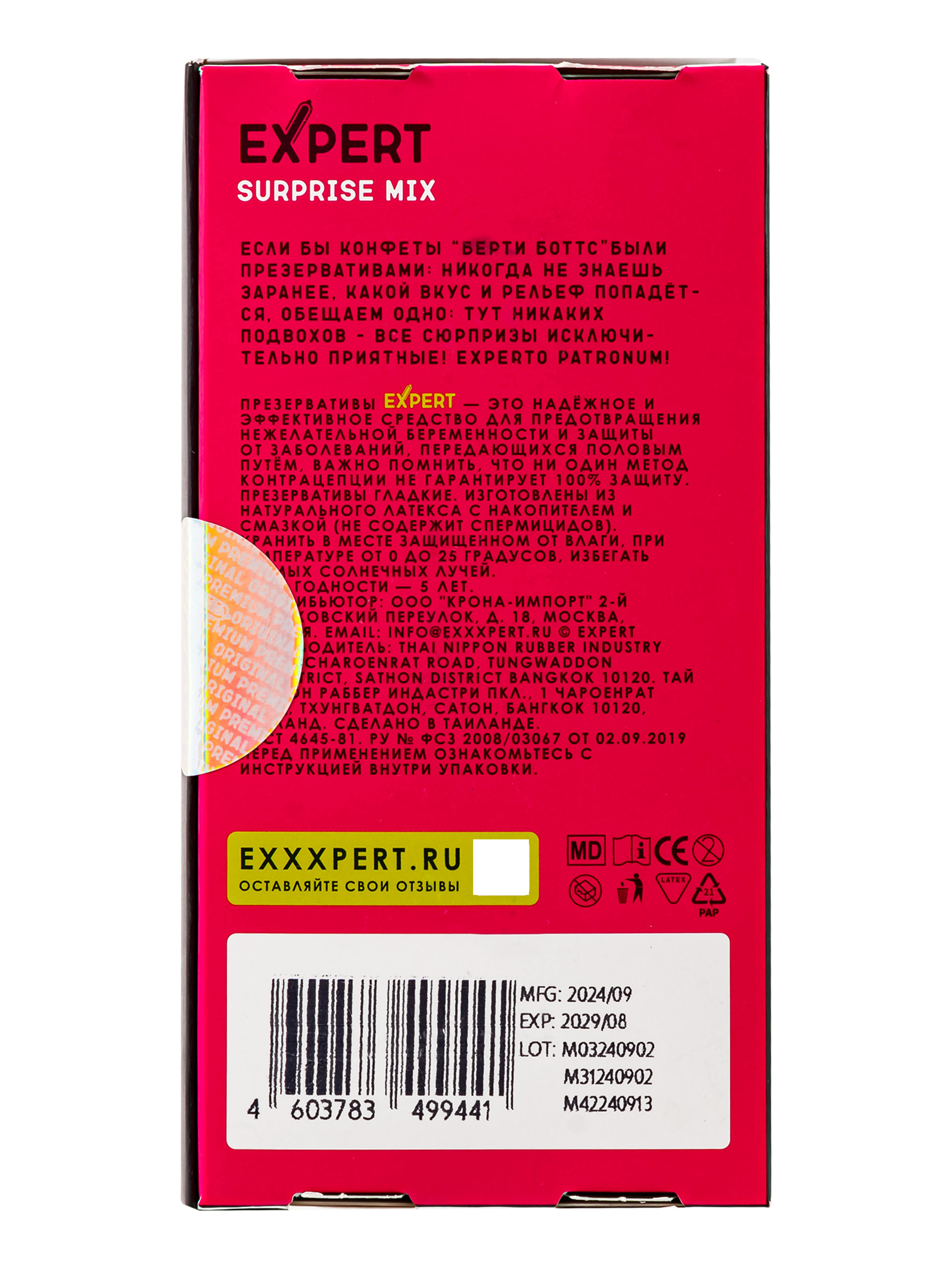 Теперь вы можете приобрести большую упаковку презервативов Expert Surprise Mix, в которой содержится 12 штук + 3 презерватива бесплатно! Это отличная возможность сэкономить и быть уверенным, что у вас всегда есть запас надежной защиты. Больше не придется беспокоиться о том, что презервативы закончатся в самый неподходящий момент.