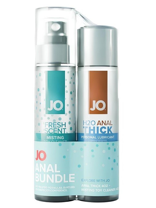 Набор из супергустого анального лубриканта JO H20 Anal Thick и специализированного очищающего спрея JO Misting Toy Cleaner.