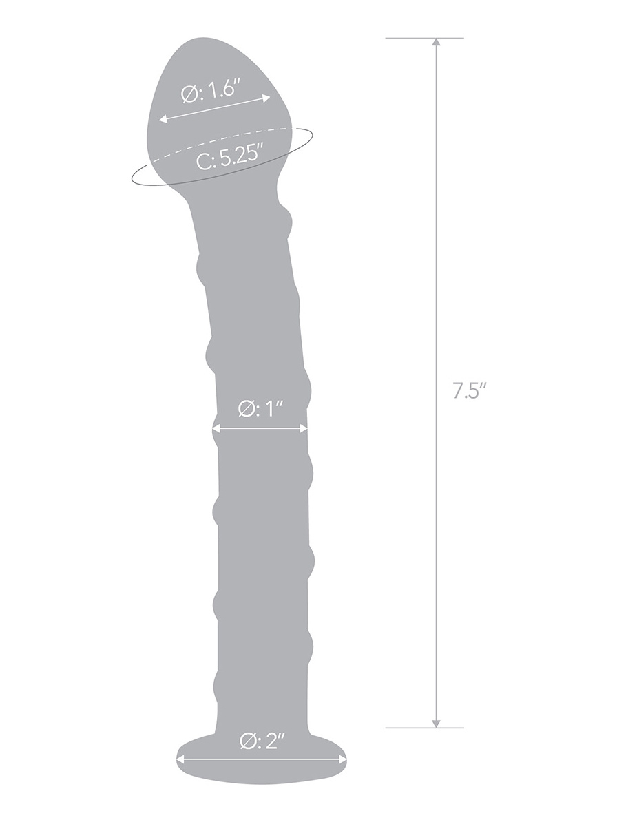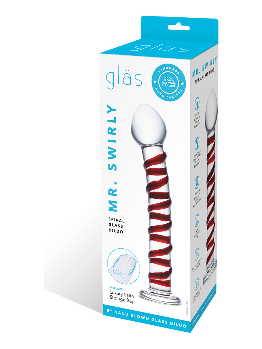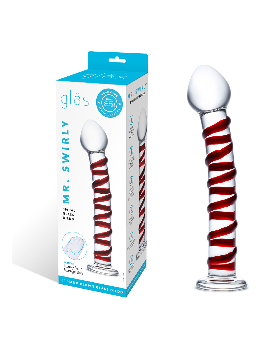 Длинный тонкий имитатор из прозрачного стекла с красной спиралью по телу. Головка имеет зауженную форму.