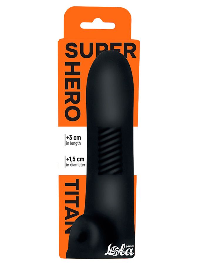 Titan из коллекции Super Hero — мощный фаллоудлинитель, созданный для заметного увеличения длины и обхвата. Он добавляет до 3 см к длине и 1.5 см к диаметру, усиливая как визуальный эффект, так и телесные ощущения. Благодаря мягкому и эластичному материалу TPR фаллоудлинитель ощущается как «вторая кожа» и комфортно адаптируется к телу. Внутренняя текстурированная поверхность обеспечивает дополнительную стимуляцию, а эластичное фиксирующее кольцо надёжно удерживает изделие на месте, проходя под мошонкой и обеспечивая стабильность во время использования. Гибкий и безопасный для тела материал прост в уходе, легко очищается и подходит большинству пользователей. Для использования достаточно нанести лубрикант внутрь фаллоудлинителя, аккуратно растянуть и надеть его на пенис, зафиксировать кольцо под мошонкой, а затем добавить лубрикант снаружи перед проникновением.