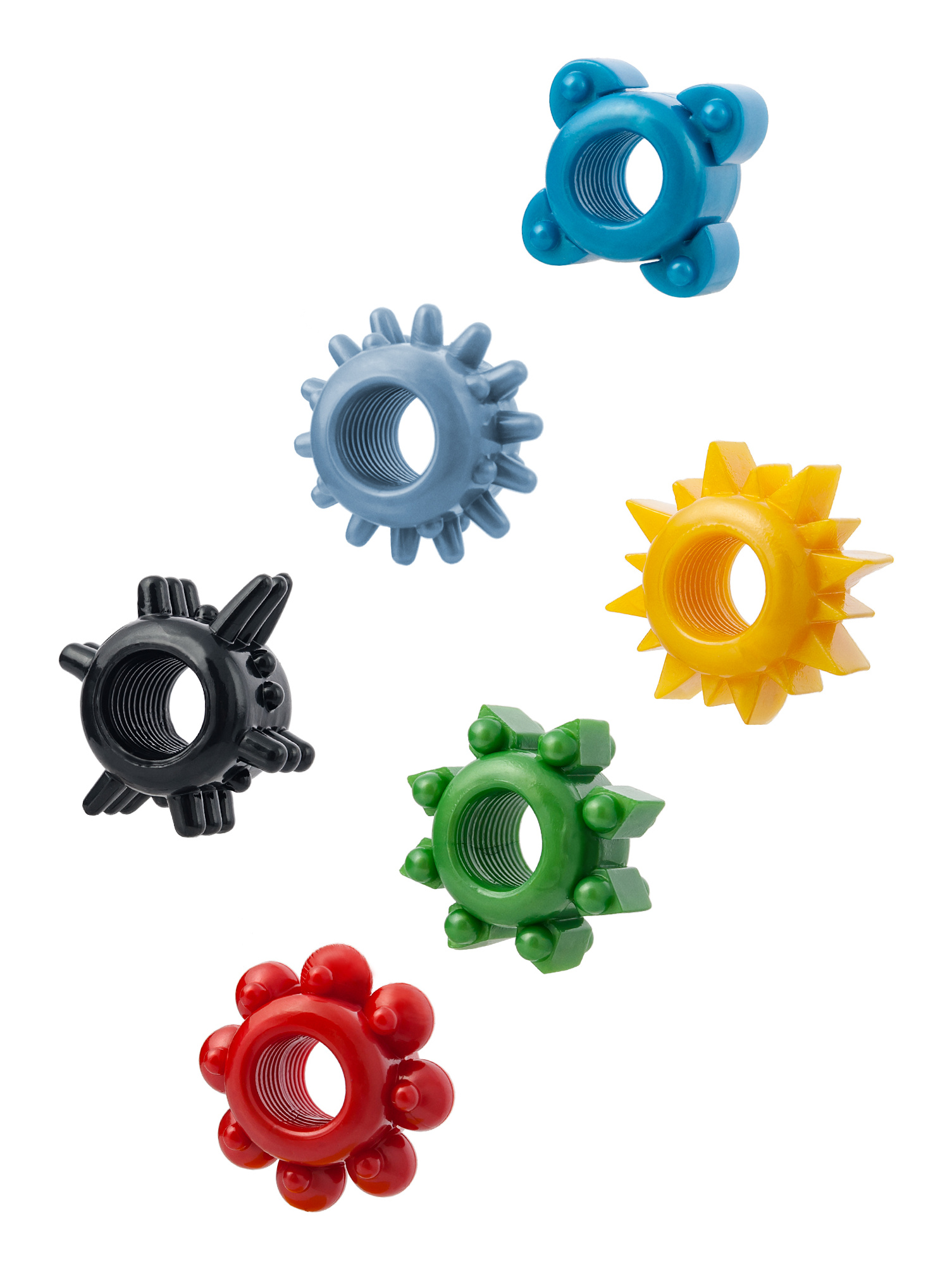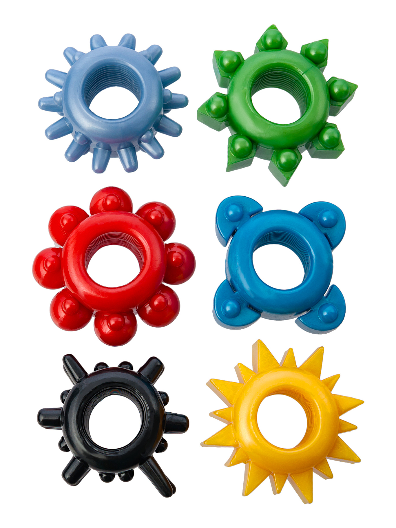 Пусть секс будет радужным! Эти разноцветные эрекционные колечки внесут некоторое разнообразие в вашу сексуальную жизнь. Все они сделаны из силикона и прекрасно растягиваются. Кроме того, приводят ваш член в состояние боевой готовности. Однако каждая имеет свой рельеф. Все эти шишечки, шипы и усики будут стимулировать клитор партнерши. Диаметр 2 см.