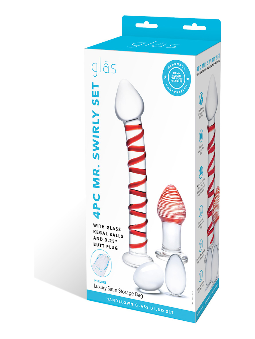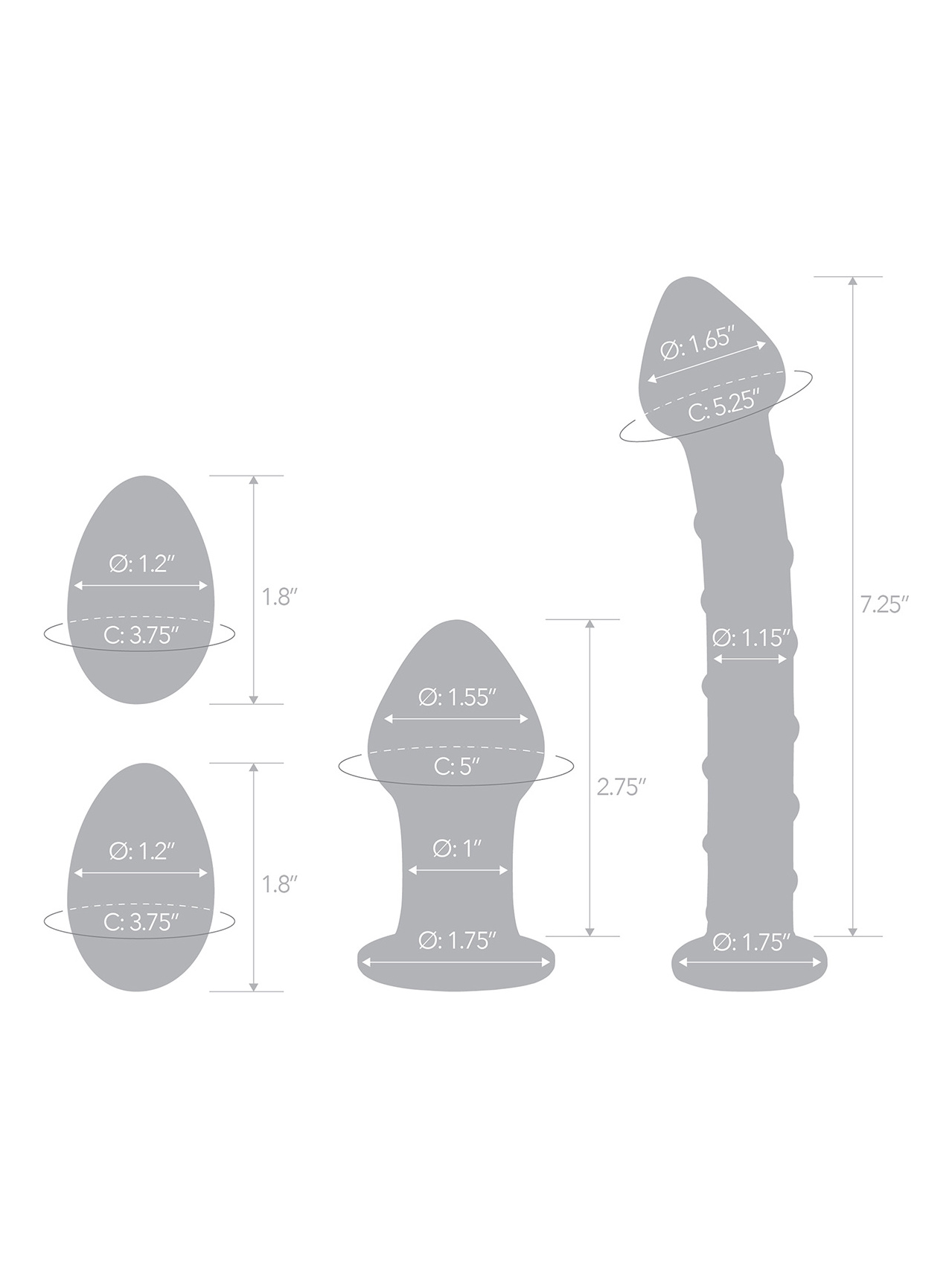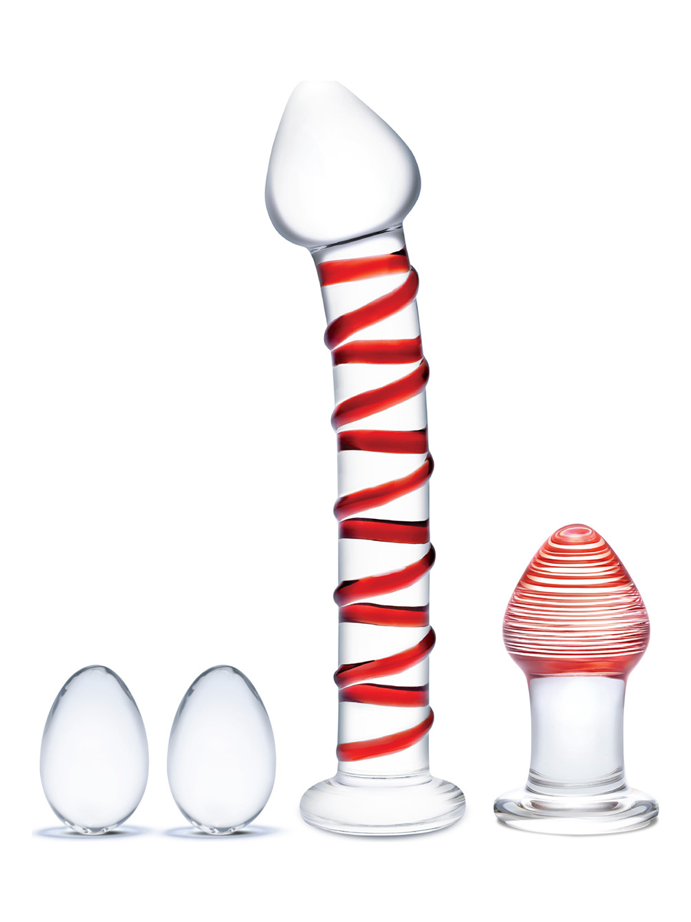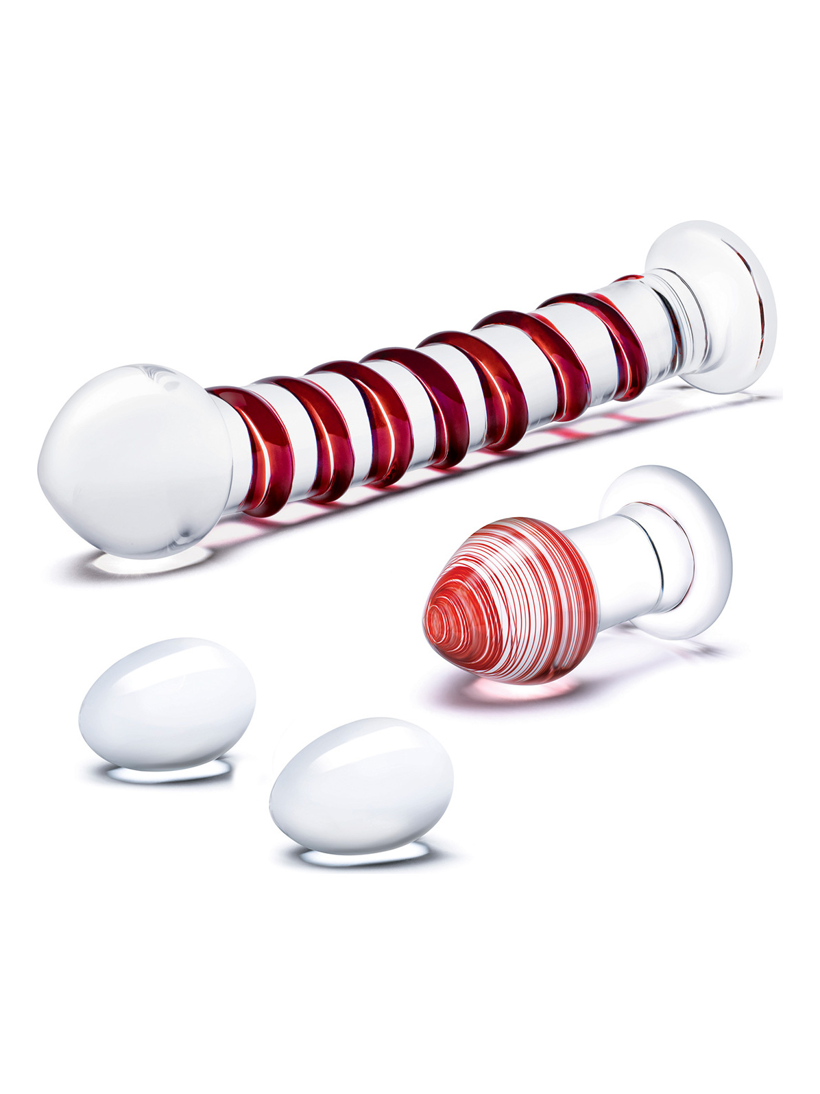 В наборе вы найдете стеклянные яйца йони, удобную небольшую анальную пробку, а также красивый прозрачный фаллоимитатор, поверхность которого покрыта рельефной спиралью красного цвета, без мошонки. Угол наклона головки и ее достаточно широкий диаметр позволяет воздействовать на точку G.