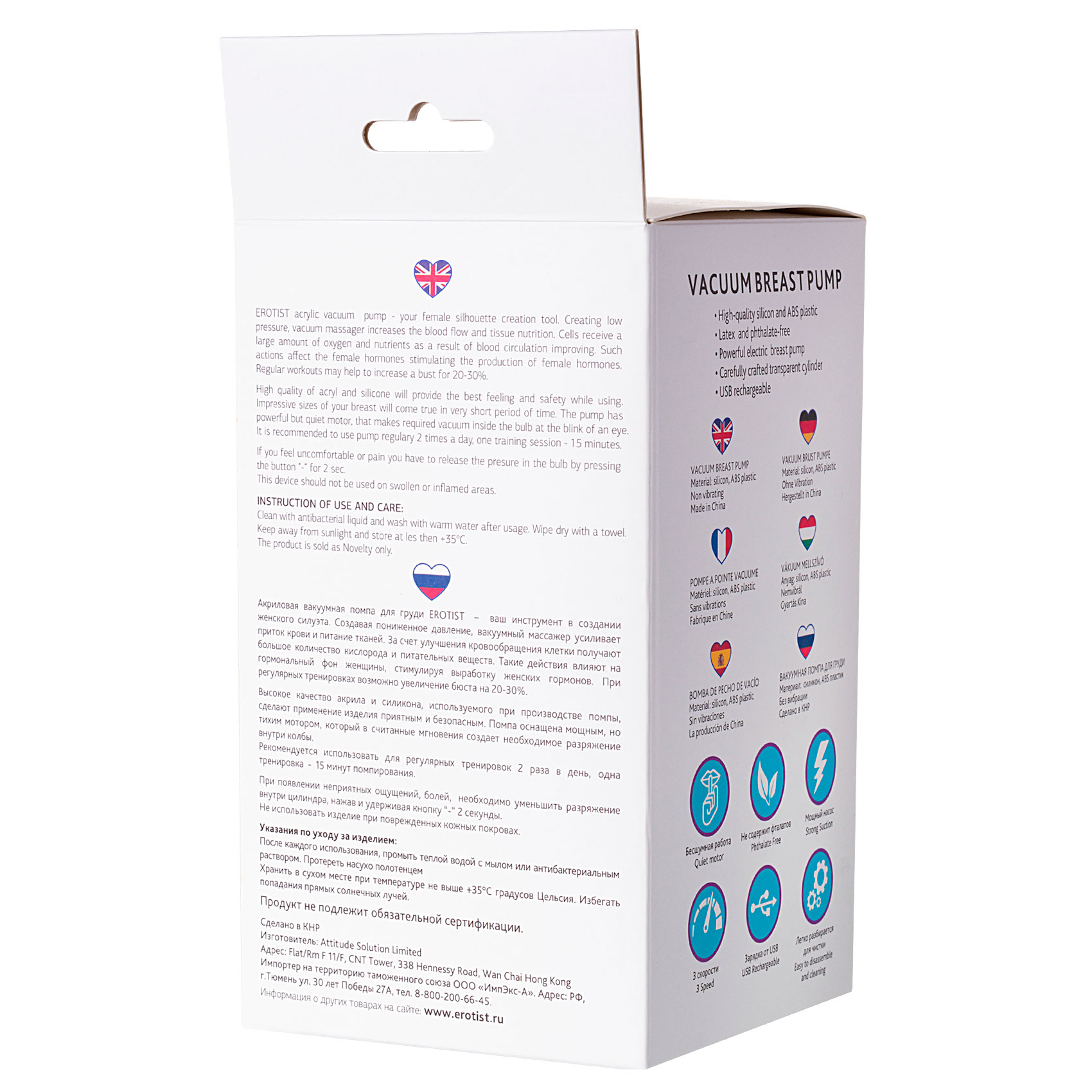 Акриловая вакуумная помпа для груди Erotist — ваш инструмент в создании женского силуэта. Создавая пониженное давление, вакуумный массажер усиливает приток крови и питание тканей. За счет улучшения кровообращения клетки получают большое количество кислорода и питательных веществ. Такие действия влияют на гормональный фон женщины, стимулируя выработку женских гормонов. При регулярных тренировках возможно увеличение бюста на 20-30%.