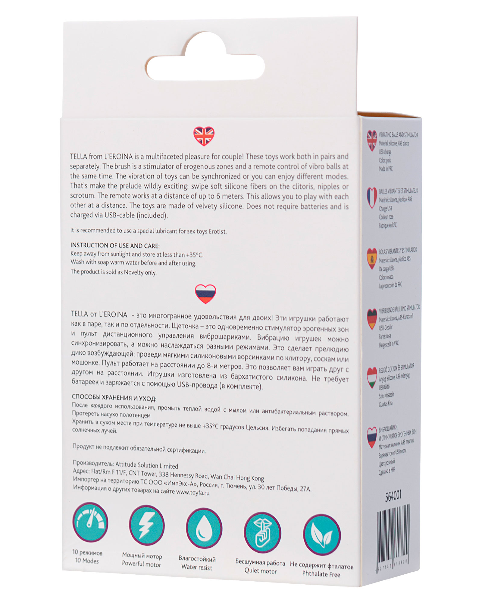 Tella из коллекции L'Eroina от ToyFa — это многогранное удовольствия для двоих! Эти игрушки работают как в паре, так и по отдельности. Щеточка — это одновременно стимулятор эрогенных зон и пульт дистанционного управления виброшариками. Вибрацию игрушек можно синхронизировать, а можно наслаждаться разными режимами. Это сделает прелюдию дико возбуждающей: проведи мягкими силиконовыми ворсинками по клитору, соскам или мошонке. Пульт работает на расстоянии до 8-и метров. Это позволяет вам играть друг с другом на расстоянии. Игрушки изготовлена из бархатистого силикона. Не требует батареек и заряжается с помощью USB-кабеля (в комплекте).
