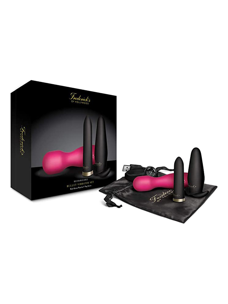 Красивый универсальный набор из трех игрушек. Перезаряжаемый usb-буллет вибратор черного цвета, покрытого силиконом. Вибромассажер с бесконтактной зарядкой имеет 20 различных паттернов работы - вибрация, пульсация, эскалация. Для полной зарядки вибратора необходимо 90 минут, время работы составляет 60 минут. Размер вибратора 9 см, диаметр 2 см. Вибратор имеет travel-lock (защиту от внезапного включения) для этого задержите кнопку на массажере на 3 секунды. Вибратор имеет защиту от брызг.