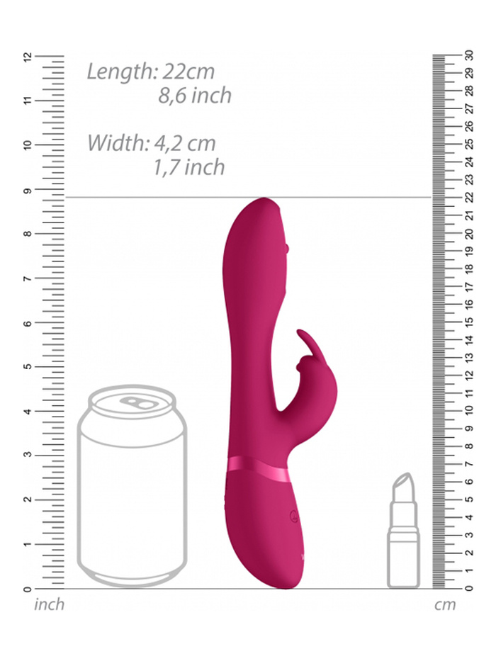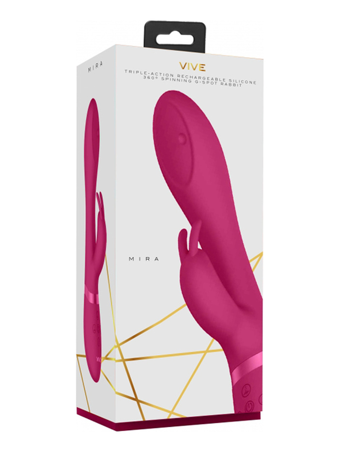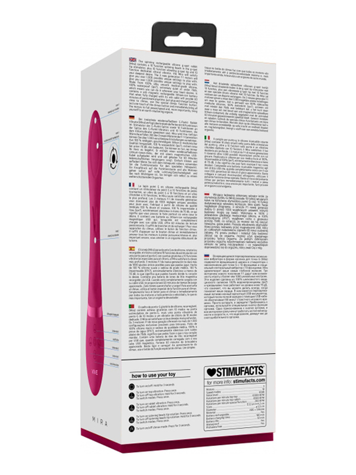 Mira – необычный вибромассажер-кролик с вращающимся шариком на вагинальном отростке. Он изготовлен из высококачественного, мягкого, нежного на ощупь 100% медицинского силикона с пылеотталкивающими свойствами и прочного, элегантного АБС-пластика. Вибромассажер оснащен инновационными электродвигателями нового поколения F1. Преимущество такого типа двигателя в том, что он делает интенсивную стимуляцию очень мягкой даже при мощном максимальном воздействии. Игрушка имеет три мощных отдельных мотора, каждый из которых обеспечивает 10 функций вибрации, способной достигать 8500 и 9000 оборотов в минуту. Это дает возможность настраивать более чем 1000 уникальных комбинаций.