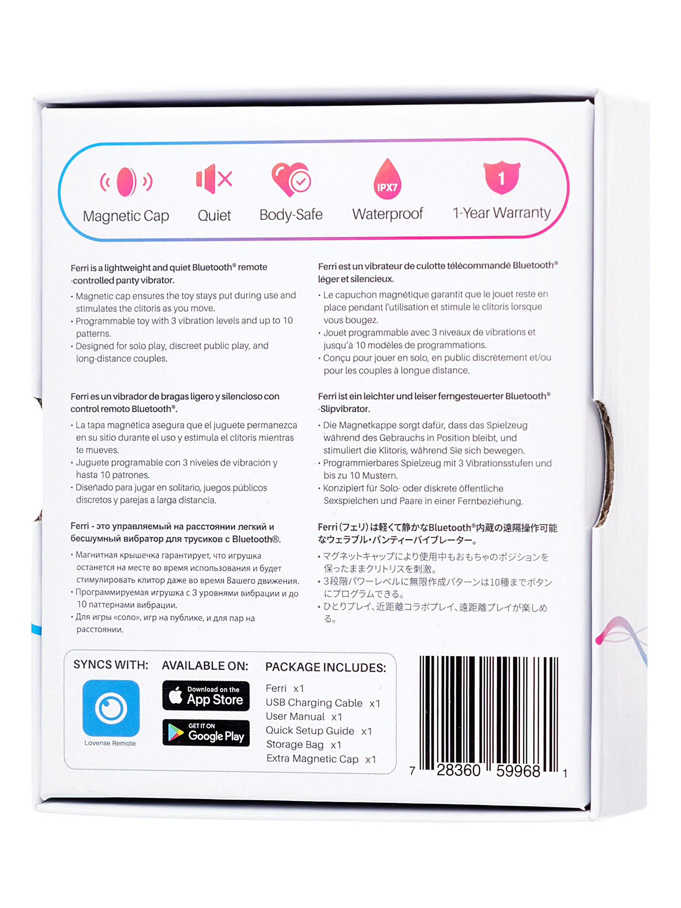 Ferri придаст перчинку всему, что вы будете делать. К концу дня вы прочувствуете все вибрации, с которыми только сможете справиться… и промокшие трусики. Его сильные вибрации и стабильное подсоединение обеспечат незабываемое времяпрепровождение во время скрытой игры в публичном месте. Благодаря компактным размерам, кстати его вес всего 35 грамм, Ferri легко носить в любом месте и наслаждаться его мощными возможностями.