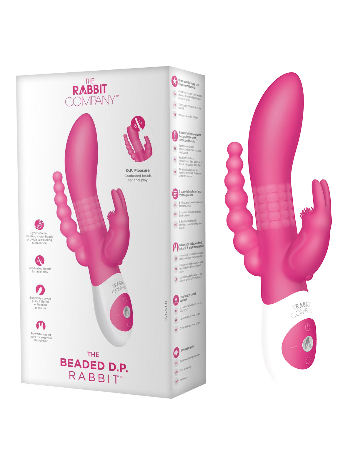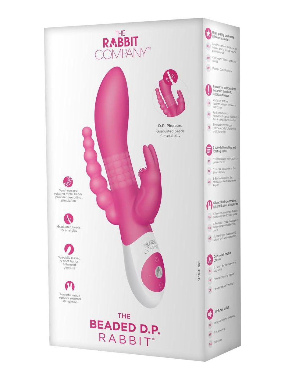 Нежный силиконовый кролик с упругими ушками имеет 6 режимов работы с 6 уровнями интенсивности, Часть для вагинальной стимуляции имеет в основании вращающиеся шарики, которые расположены в основании массажера, благодаря чему массажер воздействует на зону с самым большим количеством нервных окончаний. У массажера 6 скоростей вращения шариков. Внутри тонкого анального стимулятора из 7 бусин находится мощный моторчик.