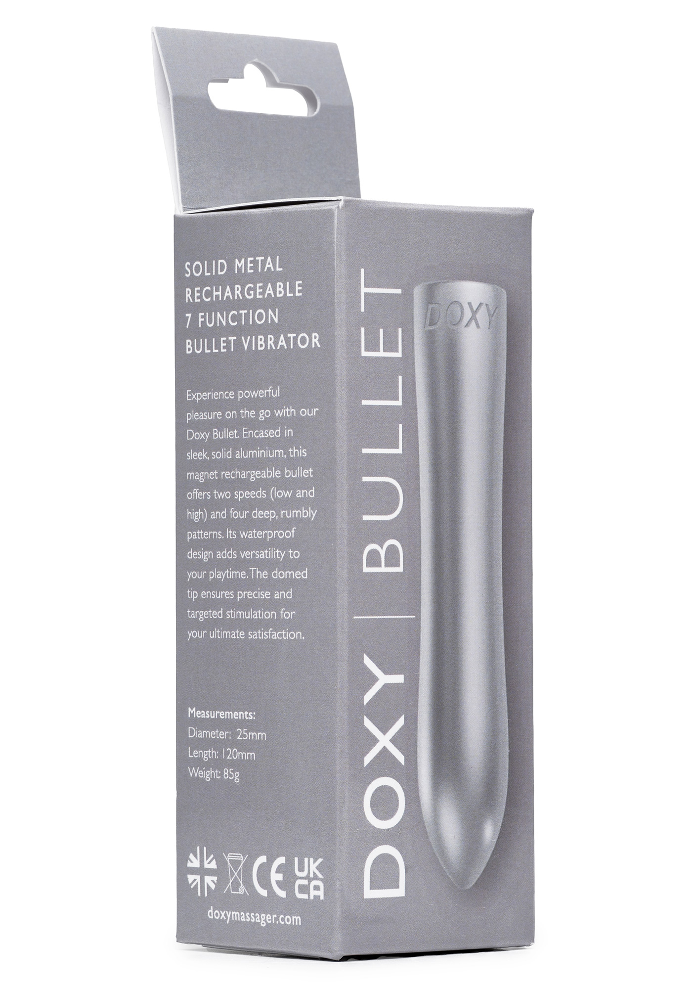 Перезаряжаемая металлическая вибропуля Doxy Bullet. Всего в вибропуле 7 режимов: 2 скорости вибрации (50% от 100%) и 5 режимов пульсации. Водонепроницаемая. USB-кабель для зарядки с магнитными контактами в комплекте.