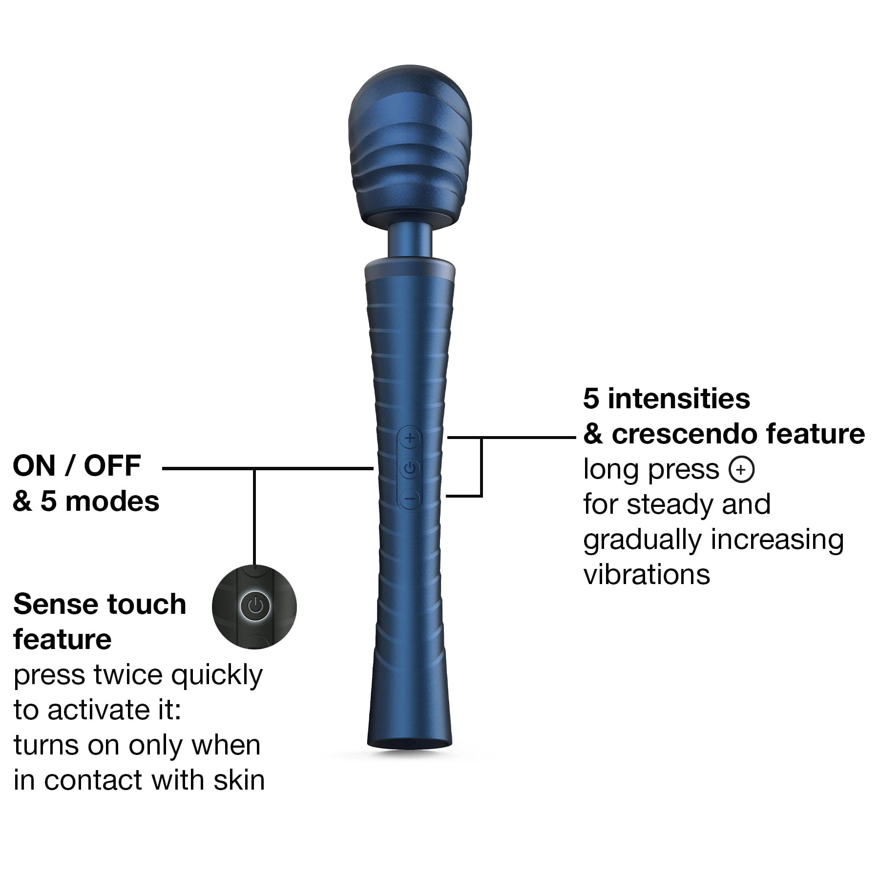 Как активировать Sense Touch? Дважды быстро нажмите кнопку — устройство завибрирует и начнёт мигать. Прикоснитесь головкой к коже — вибрация активируется автоматически. Чтобы отключить режим, повторите двойное нажатие.